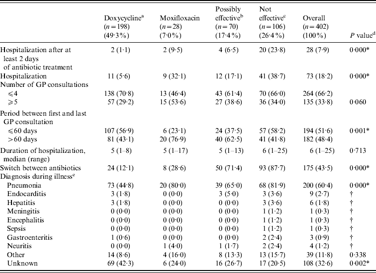 In 2007 and 2008 more than a quarter of patients received β-lactam or azithromycin as initial antibiotic treatment, which are not considered to be effective against C. burnetii. No fewer than 24% of the patients who were treated initially with one of these antibiotics was hospitalized after at least 2 days of antibiotic prescription. The therapeutic delay differed considerably between 2007 and 2008; both for delay until the first antibiotic treatment was prescribed and for delay until the first or second choice antibiotics (200 mg/day doxycycline and moxifloxacin) were prescribed. Particularly the long therapeutic delay for doxycycline at the appropriate dose in 2007 is remarkable. This suggests that the recommended treatment in these cases was prescribed only when the serological test, perhaps unexpectedly, showed a positive result. Probably, the difference in therapeutic delay between 2007 and 2008 in general is because in 2007 Q fever was a relatively unknown disease that had not previously occurred in The Netherlands at this scale. Therefore, during the outbreak in 2007, GPs were not familiar with the clinical picture and unaware of existing recommendations for treatment. Increased awareness among GPs and medical specialists, as a consequence of widespread targeted information from the local health authorities and the attention in the medical and national press [Reference Nabuurs-Franssen5, Reference Van Steenbergen16], shortened the diagnostic and treatment delay in 2008. These specific treatment recommendations could also have contributed to the increase in prescriptions for doxycycline and the decrease in moxifloxacin in 2008.