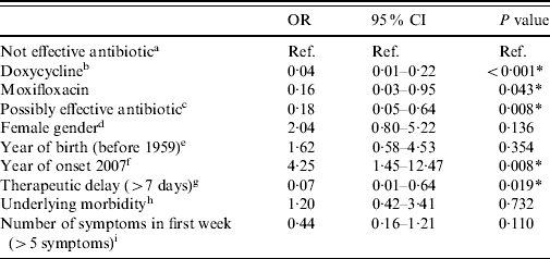 In the univariate logistic analysis, hospitalization after antibiotic treatment for at least 2 days after prescription was significantly associated with age, year of disease onset and therapeutic delay. In the multivariate analysis, with the same outcome measure, a total of 388 cases were included. All treatment groups showed significantly lower risks for hospitalization in Q fever patients compared to the group of potentially ineffective antibiotics such as penicillins (Table 4). Doxycycline at the appropriate dose (200 mg/day) showed the lowest risk and was the most significant. A long therapeutic delay (>7 days) was also significantly associated with a lower risk for hospitalization. A disease onset in 2007 was significantly associated with a higher risk for hospitalization.