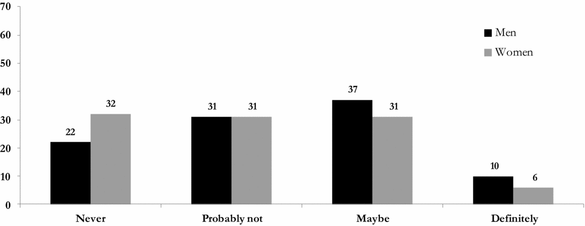 Similar to most adults, the majority of young people do not envision running for office. Among those who do, however, there is a substantial gender gap. Young women and men are not equally politically ambitious. We asked our respondents whether they ever thought that, someday, when they were older, they might want to run for any political office. Forty-one percent stated that the idea of running for an elective position had at least “crossed their mind.” The data presented in Figure 1A, however, reveal that men were almost twice as likely as women to have thought about running for office “many times,” whereas women were roughly 20% more likely than men never to have considered it. Put somewhat differently, 35% of women, compared to 48% of men, considered running for office. When we turn to the question of young people's plans to run for office in the future, the gender differences are just as stark. Men were two-thirds more likely than women to report that they “definitely” plan to run for office at some point in the future. Women, on the other hand, were 45% more likely than men to assert that they would never run (see Figure 1B).
