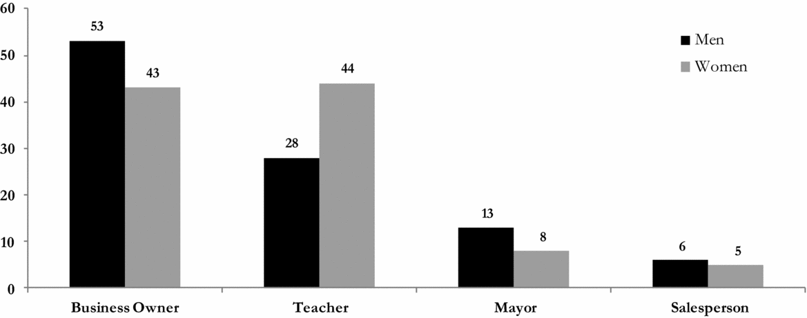 In a first scenario, we presented respondents with four career options—business owner, teacher, mayor of a city or town, and salesperson—and asked them which they would most like to be, assuming that each paid the same amount of money. Although both women and men ranked owning a business and being a teacher as more desirable than serving as a mayor, men were almost two-thirds more likely than women to select mayor as their preferred job (see Figure 2A). When we asked respondents to indicate which of the four positions they would least like to hold, a substantial gender gap emerged as well: 43% of women, compared to 31% of men, reported that mayor was their least preferred profession (this was the top answer for women).