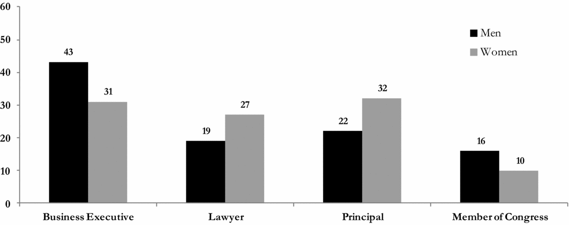 We then asked respondents to indicate which of the following four higher echelon jobs they found most appealing: business executive, lawyer, school principal, or member of Congress. Once again, women were significantly more likely than men to eschew the possibility of a political career. The data presented in Figure 2B reveal that men were 60% more likely than women to select a position as a member of Congress. On the other hand, 43% of women, compared to 33% of men, reported that serving in Congress was the least desirable professional option.