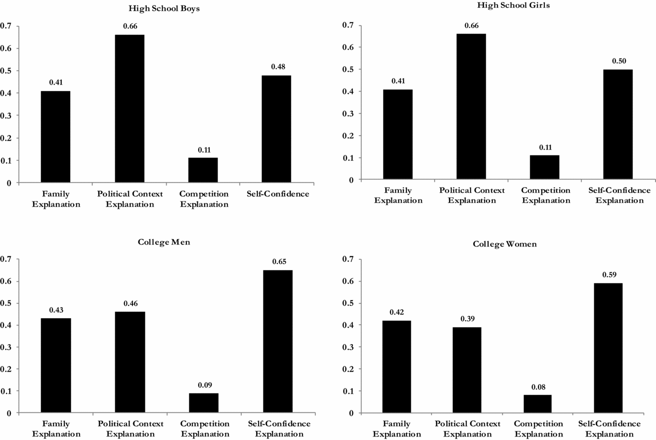 Although we face some data constraints in explaining fully what forces contribute to the differences between high school and college students’ political ambition, our results are vitally important because they allow us to pinpoint the phase of life at which gender differences in interest in running for office materialize.