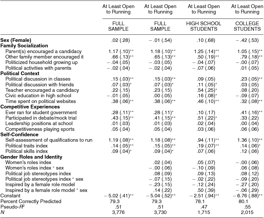 Because the majority of respondents are neither certain that they will run for office nor have dismissed the possibility outright, we also perform our analysis with a collapsed version of the four-point scale. Table 2 presents four logistic regression equations that predict political ambition with a dichotomous dependent variable that indicates whether the respondent is at least open to the idea of running for office in the future. As is the case with Table 1, we perform the analysis first on the full sample and then restrict the analysis to the high school and college subsamples.