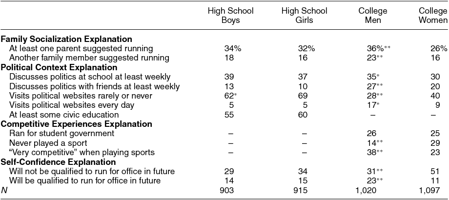 Undoubtedly, these five research expectations are interrelated, and there are likely some complex causal relationships among them, as is often the case with political socialization research. Further, ours is a temporal argument that assumes that these central expectations predate the development of political ambition. This is not to say that respondents who are politically ambitious might not initiate more politicized family activities or seek out a more politicized context in their personal surroundings. But it is difficult to conceptualize how political ambition could develop without—let alone cause—experiences such as having political discussions in the household, engaging in competitive activities, or possessing a broad sense of self-confidence. Together, therefore, these explanations represent a series of early life experiences and socialized attitudes and behaviors that may influence political ambition. The gendered component of each suggests that they will also account for the bivariate level gender gap we uncovered in young people's interest in running for office.