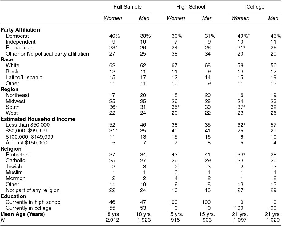 To investigate the relationship between early life experiences and the gender gap in political ambition, it is critical to survey respondents at a time that is more proximate to the original formation of attitudes about running for office. Thus, we conducted the first national survey of high school and college students’ political ambition. From September 27 to October 16, 2012, we surveyed a national random sample of 1,121 male and 1,042 female high school students (ages 13 to 17) and 1,020 male and 1,097 female college students (ages 18 to 25).Footnote 3 The survey allowed for an in-depth examination of whether a gender gap in political ambition exists among young people, as well as the factors that might contribute to or sustain it. More specifically, we designed the survey so that we could operationalize the effects of political socialization on political ambition.
