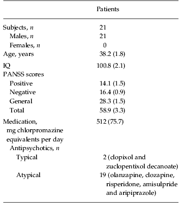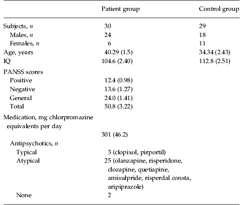 For the study which compared patients with controls, a group of 29 control participants was recruited (Table 1). These were age, gender and IQ matched to the patient group. IQ was estimated from errors in the National Adult Reading Test. Inclusion criteria stipulated no psychiatric history and no history of drug or alcohol problems.
