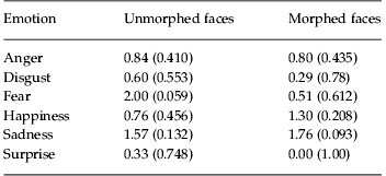Participants in both experiments carried out the hexagon emotion discrimination task, used to characterize emotion recognition (Calder et al. Reference Calder, Young, Rowland, Perrett, Hodges and Etcoff1996). They received instructions on-screen prior to the task. The instructions were as follows. ‘You will see a face presented on the screen. You are to indicate which word best describes the emotion in the face. Please press keys 1 to 6 to choose the emotions.’ On each trial, a face was presented for 1000 ms. This was followed by a choice screen which presented the options with a number next to each emotion name. Participants used the keyboard to indicate their choice. The faces were drawn from the Ekman series (Ekman & Friesen, Reference Ekman and Friesen1971). Both unmorphed and morphed (70%/30%) faces were used. There were a total of 192 trials, of which half were morphed. Four different identities (IDs) were used [two male (IDs 2 and 10) and two female (IDs 9 and 11) from the Ekman set] and each image was shown four times, not sequentially. Stimulus order was randomized across all conditions including morphed and unmorphed. Morphs were between the following pairs of emotions: happiness–surprise; surprise–fear; fear–sadness; sadness–disgust; disgust–anger; anger–happiness. Morphs between these emotions are used as these are the emotions which are most often confused when emotions in unmorphed faces are identified (Calder et al. Reference Calder, Young, Rowland, Perrett, Hodges and Etcoff1996). The morphs were generated using Abrosoft Fantamorph software (Abrosoft, USA). To morph the images, corresponding points are first defined on the two images between which the morphs would be produced. The points were located on the eyes, nose, mouth, chin and forehead. The software then stretches the images, as if they were printed on a sheet of rubber, such that points on the morphed image lie between the points on each of the unmorphed images, with the distance given by the morph fraction. For example, for a 70% fearful/30% sad morph, the points would be stretched so they would lie 70% of the way to the fearful face, from the sad face, and correspondingly 30% of the way to the sad face, from the fearful face. The pixel intensity values were then blended between the two stretched faces, using the appropriate weight, for example, a 70% weight on the fearful and a 30% weight on the sad pixel intensities. Additional details of the procedure have been given previously (Calder et al. Reference Calder, Young, Rowland, Perrett, Hodges and Etcoff1996).