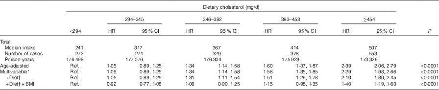 Table 3 Age-adjusted and multivariable-adjusted hazard ratios (HR) of type 2 diabetes according to the quintiles of dietary cholesterol in the Etude Epidémiologique auprès des femmes de la Mutuelle Générale de l’Education Nationale cohort study (1993–2008) (Hazard ratios and 95 % confidence intervals)