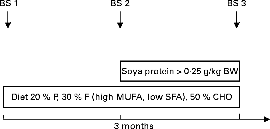 After inclusion into the programme patients were to follow a diet reduced in SFA, modified in fatty acid pattern (increase in MUFA and PUFA) and rich in complex carbohydrates and phytonutrients for 3 months (phase 1 diet). Thereafter, patients and their parents were instructed to include soya protein of at least 0·25 g/kg body weight into their diet for a period of 3 further months, thereby substituting soya protein for animal protein (Fig. 1). This was achieved by the introduction of soya foods (Alpro soya dairy-free milk alternatives), which were consumed substituting dairy protein and/or a mixture of other animal proteins. Each patient was instructed to consume a minimum amount of soya products per d. Adherence to both types of diet was assessed by means of multiple 1-week dietary records, which a registered dietitian discussed with the patient and parents in detail whereby written material containing personalised dietary recommendations was provided. Patients and their families were seen weekly throughout the first month, thereafter after 2 and 3 months of each phase. If a patient did not show up to an appointment, an alternative appointment was sought by the dietitian, thereby maximising adherence. Quantitative fatty acid intake was calculated by analyses of the dietary records. The content of isoflavones in the soya products used was on average 27 mg isoflavones per 10 g soya.