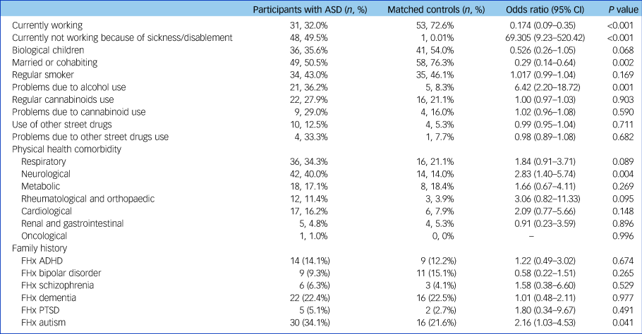 Data comparing sociodemographic phenotypes, physical health and family history for participants with ASD and controls are presented in Table 3. The average age of the participants with ASD was 37.8 years (s.d. 12.3) and for controls it was 40.7 years (s.d. 14.1, P = 0.89) because of matching. There were 80 males and 25 females among the participants with ASD (76.2% male), and 55 males and 21 females in the control participants (72.4% male, P = 0.56). Adults with ASD were significantly less likely to be currently working (odds ratio 0.174, P <0.001), to be married or cohabiting (odds ratio 0.29, P = 0.002), to be currently off work because of sickness or disablement (odds ratio 69.305, P <0.001) and to have alcohol-related problem (odds ratio 6.24, P = 0.001). No differences were found in rates of having one or more biological children.
