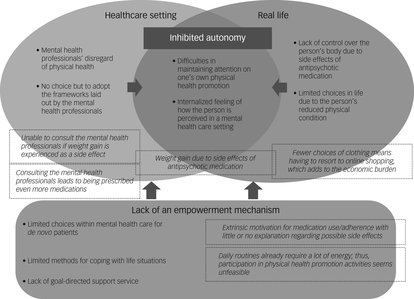 The inhibited autonomy component was shaped by the service users' experiences both in the healthcare setting and in real life. The healthcare setting component comprised barriers to physical health promotion at routine psychiatric services. The real life component comprised barriers to physical health promotion in daily living due to side effects of antipsychotic medication and symptoms of mental illness. The inhibited autonomy component itself comprised ‘difficulties in maintaining attention on one's own physical health promotion’ and ‘internalised feeling of how the person is perceived in a mental healthcare setting’.