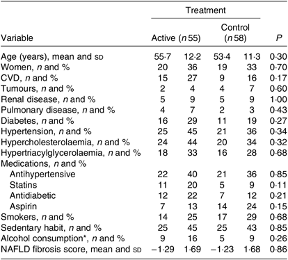 General and clinical characteristics were similar in the active (n 55) and control (n 58) supplementation groups (Table 1). Overall, a relatively high proportion of study participants were carriers of risk factors for CVD, such as diabetes, hypertension, or hypercholesterolaemia, hypertriacylglycerolaemia, or had unhealthy lifestyles, smokers being more than 25 % and people with sedentary habits being about 45 %; average BMI was 30 kg/m2, with about 50 % of subjects obese (Table 2). Similarly, no difference was found between the two groups with regard to anthropometric variables, medications (Table 2), blood pressure and complete blood cell counts (data not shown). The NFS was on average low and similar for the two treatment groups. Only a minority (7 %) of participants yielded an NFS compatible with severe fibrosis or cirrhosis. None of the subjects had signs of advanced liver disease.