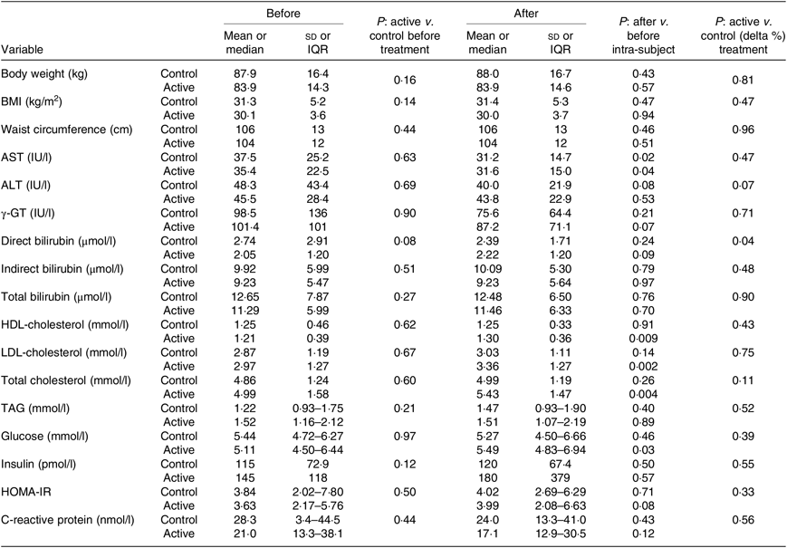 The results of the secondary endpoints of the study, that is, other liver function, metabolic and inflammatory variables, did not show any difference within and between treatments, except for a slight but significant increase at T1 of HDL, LDL and total cholesterol by 7·1, 13·0 and 8·8 %, respectively, and glucose by 5 % in the active group.