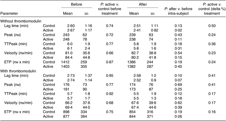 Table 4. Thrombin generation parameters at baseline and after the 3-month supplementation with active mixture or control*