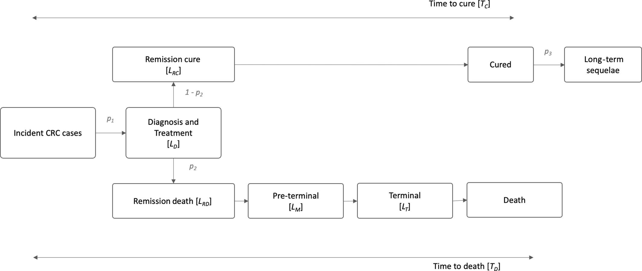 Fig. 1. Three-stage natural history for colorectal cancer (CRC), based on Soerjomataram et al. (2012). LD: duration of diagnosis and treatment; LR: duration of remission; LM: duration of preterminal/metastatic phase; LT: duration of terminal phase; p1: incidence of CRC; p2: case fatality of CRC; p3: probability of long-term sequelae; Tc=7 years and TD = 1·6 years.