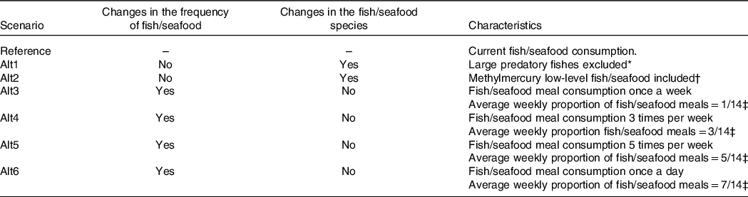 Six alternative scenarios of fish/seafood consumption were considered to compare the health risks and benefits with the current fish/seafood consumption, which is considered as the reference scenario. The characteristics of each scenario are described in detail in Table 1.