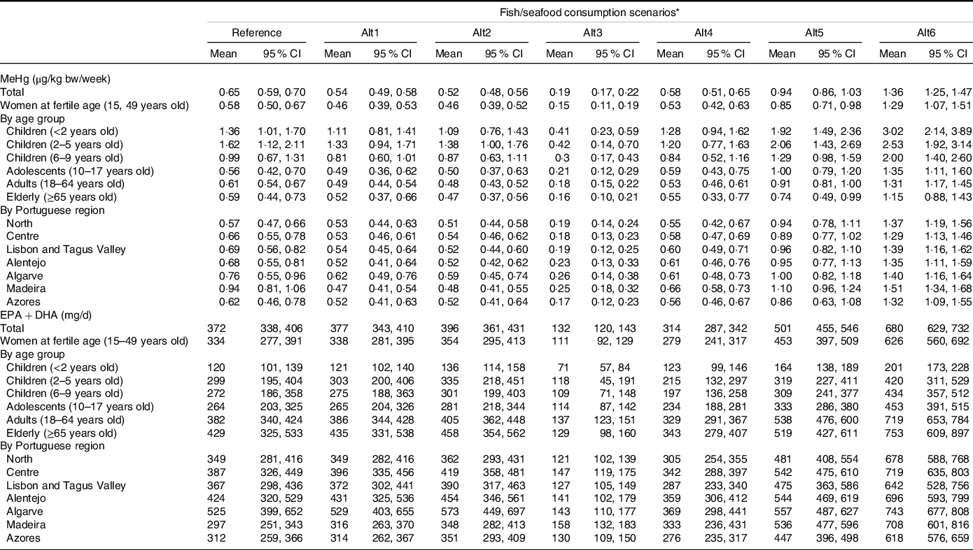 First, we considered two alternative scenarios where the amount and frequency of fish/seafood were equal to the reference scenario, changing only the type of fish consumed. Thus, in the first alternative scenario (alt1), the consumption of large predatory fish species (see Table 1) was replaced by other fish species. A second, more conservative, alternative scenario (alt2) was defined replacing the consumption of fish/seafood with MeHg levels > 0·25 mg/kg by species with MeHg levels ≤ 0·25 mg/kg (Table 1). All the replacements were implemented according to the probability of consumption of the fish/seafood species within the Portuguese population, according to sex, age group and geographic region.