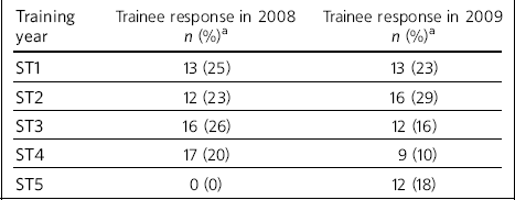 Training year Trainee response in 2008 n (%)a Trainee response in 2009 n (%)a