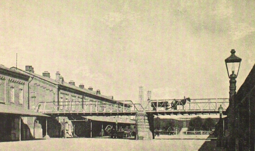 Figure 1: The yard between slaughterhouses for cattle connected with a bridge. Source: S.A. Poderni, Tekhnicheskoye opisaniye Moskovskikh tsentral'nykh gorodskikh boyen (Moscow, 1896). State Public Historical Library of Russia.