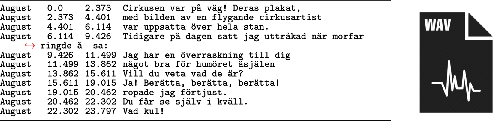 We have offered a review of the various aligners on the market because this paper is, after all, about forced alignment. We would like, however, to point out that in the case of the Nordic languages, the comparative merits of each aligner do not matter much. In the case of Swedish, we had neither sufficient material to train an aligner like the MFA, nor were there pre-trained models available (and even today, the MFA model for Swedish sits behind a paywall). The picture is the same for Danish, Estonian Swedish, Faroese, Fenno-Swedish, Icelandic, the Northern and Western Norwegian dialects, and Övdalian. Absent of a large corpus of transcribed material, researchers will not be able to use MFA’s out-of-the-box trainer. The only reasonable alternative is the one we propose here.