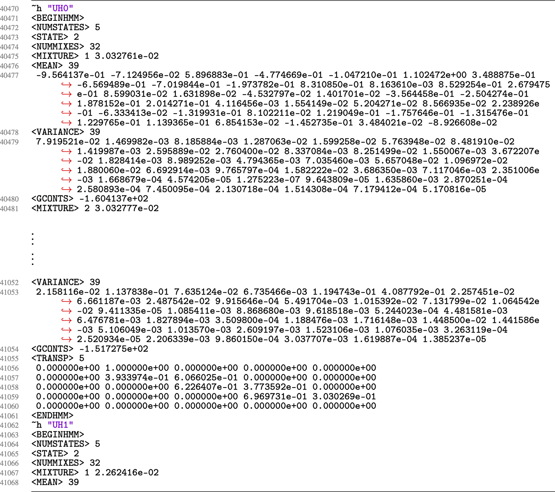 Figure A6. Excerpt from lines 40470 to 41068 of the hidden Markov model vectors for the monophone UH in unstressed position (indicated by ~h “UH0”).