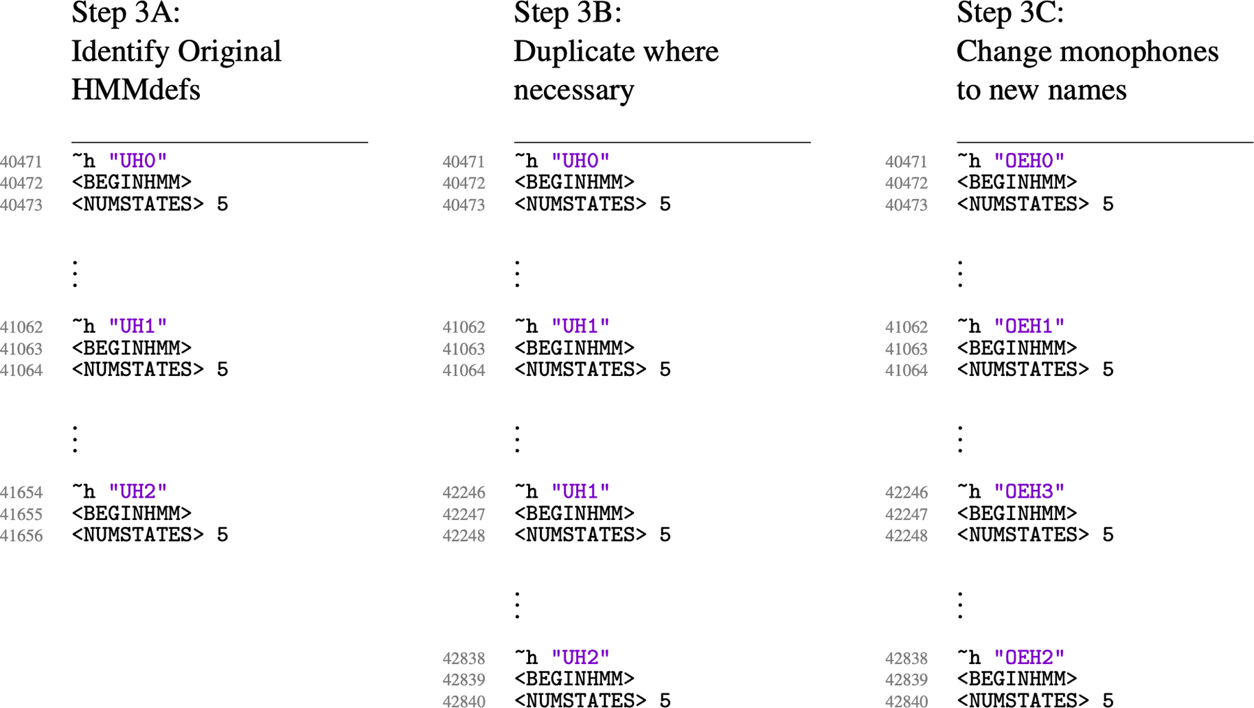 The hidden Markov vectors for each monophone-including-stress is defined in the hmmdefs files. Figure A6 shows a snapshot of the vectors for the monophone UH0 for a 16,000 Hz sound file (/FAVE-align/model/16000/hmmdefs). The monophone is defined in the quotes that follow h. The Swedish monophones were substituted in for the closest-sounding English monophone, as shown in Figure A7. Since there are more Swedish monophones than English ones, many of the vectors were duplicated. For example, since only three vectors exist for UH (UH0, UH1, and UH2), UH1 was duplicated and then one duplicate was changed to OEH1 and the other to OEH3. UH0 became OEH0, and UH2 became OEH2.