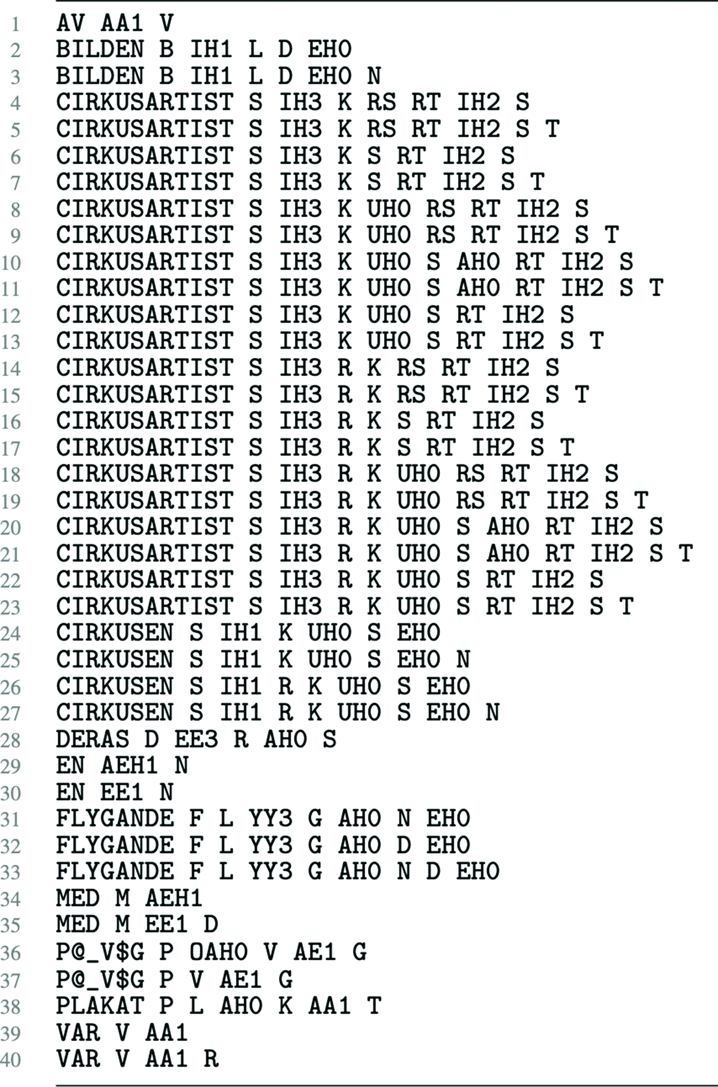 In 2003, Nordic Language Technology Holdings, Inc. (NTS) filed for bankruptcy, and the Norwegian National Library procured its intellectual property for public dissemination. At the time, NTS was working on Automatic Speech Recognition (ASR) for Danish, Eastern Norwegian (bokmål), and Central Swedish. All three of the NTS pronunciation dictionaries have been released to the public, but their accuracy could not be guaranteed. Whereas Folkets Lexikon is widely accepted as a credible source and has a chain of provenance in terms of its development, NTS is simply a file the first author ‘stumbled across’. We therefore reconciled the NTS entries with Folkets Lexikon. The NTS entries matched all but 609 of the 18,928 Folkets Lexikon entries.