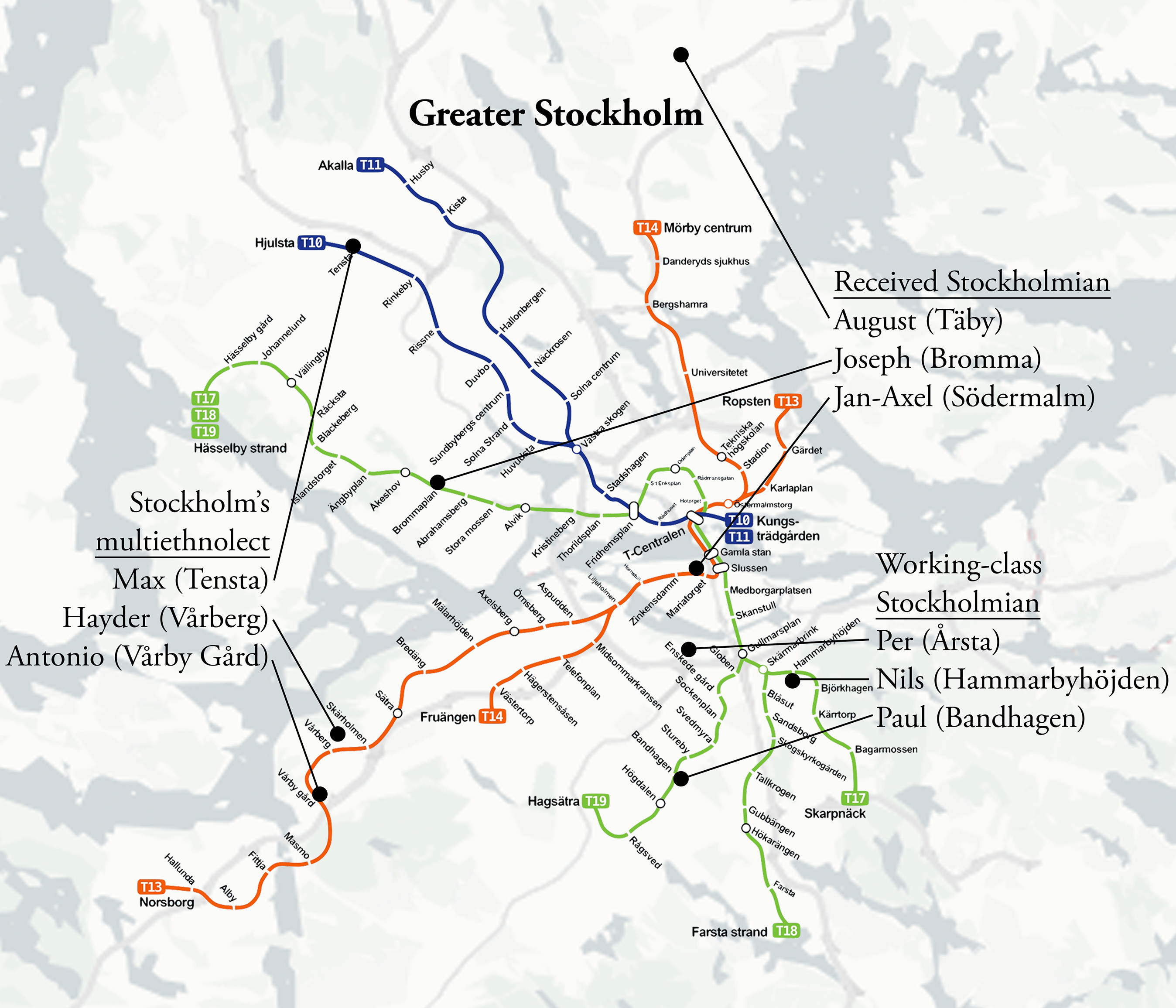 Figure 4. Map of greater Stockholm and its metro. Home neighborhoods of the nine speakers are plotted, and speakers are itemized according to their respective social dialects.