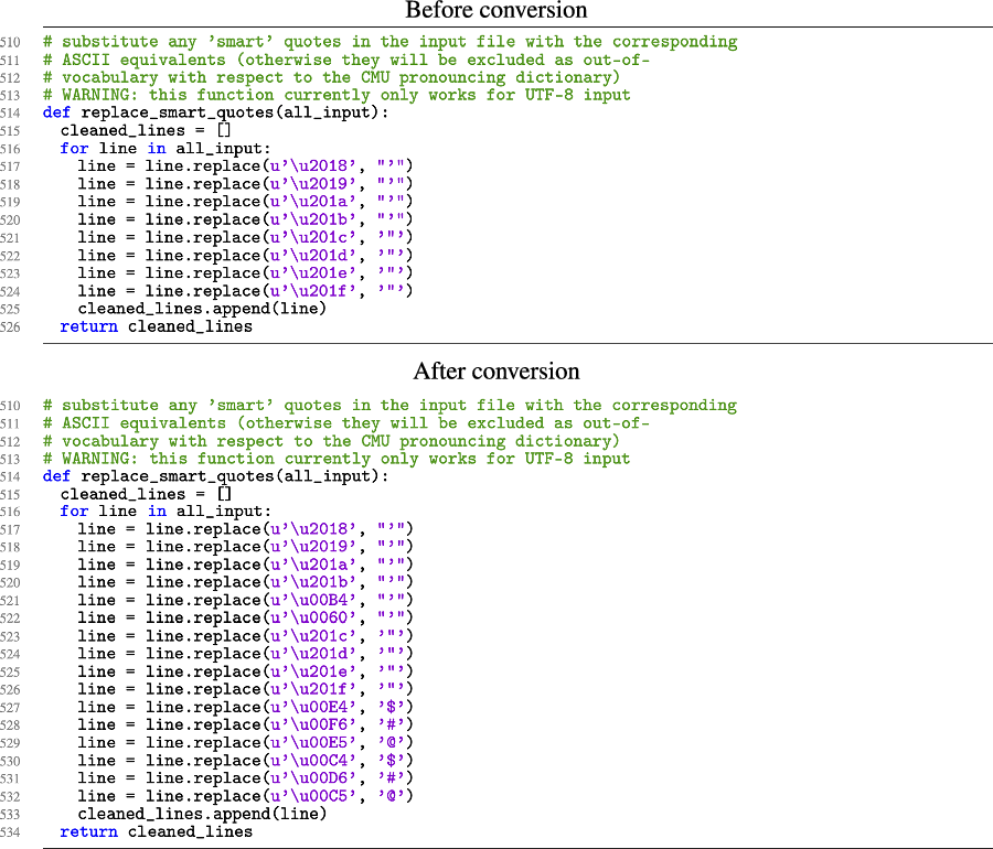 Even though FAVE-Align is restricted to ASCII, its script has a number of sophisticated protections built to keep things running even if there are non-ASCII characters in the transcription that would otherwise upset the program. These ‘fixes’, so to speak, begin on line 510, shown in the upper half of Figure A5. As line 513 indicates, this only works for transcriptions in Unicode 8 (UTF-8). The regular expressions from lines 517 to 520 turn the four most common rich-text single quotes into an ASCII single quote. The regular expressions from lines 521 to 524 turn the four most common rich-text double quotes into an ASCII double quote.