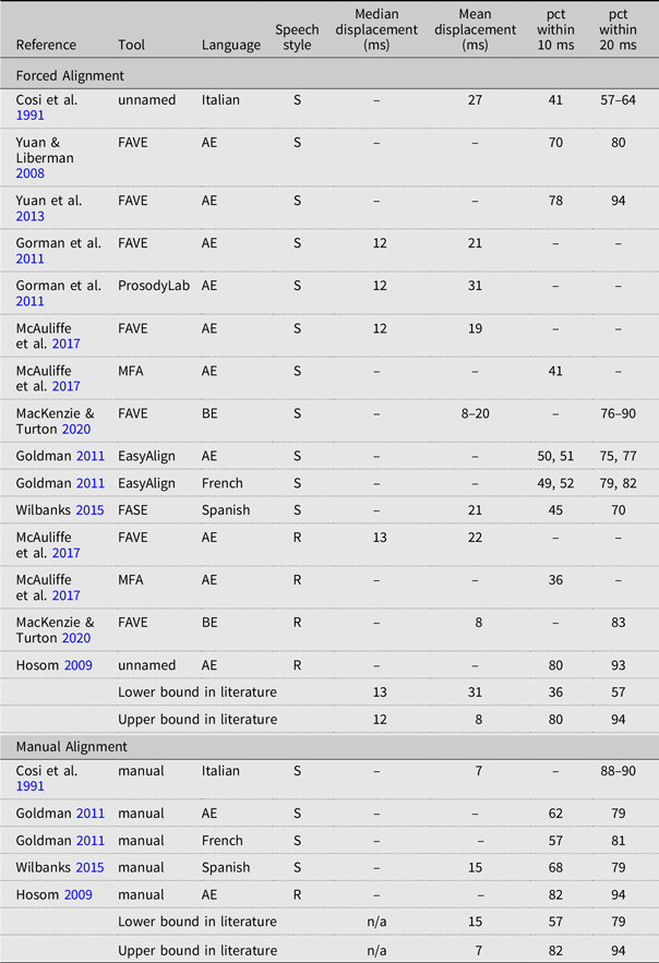 As regards the median and mean differences, some studies have calculated these solely for vowels (Evanini Reference Evanini2009:56) or have calculated them from log-transformed absolute values (Wilbanks Reference Wilbanks2015; Gorman et al. Reference Gorman, Howell and Wagner2011). Here, we calculate them for all phonemes. Some studies have also used standard deviations (Labov et al. Reference Labov, Rosenfelder and Fruehwald2013) or the percentage of boundaries that fall within 5, 25, 30, 40, 50, and 100 milliseconds of the manual benchmark (Cosi et al. Reference Cosi, Falavigna and Omologo1991:695; McAuliffe et al. Reference McAuliffe, Socolof, Mihuc, Wagner and Sonderegger2017:500). We chose not to include these metrics because their adoption is not sufficiently widespread. The below review will first cover automatic alignment benchmarks followed by manual alignment benchmarks. In select cases where visual figures are provided with no actual number, we have estimated the number by lining a straight edge between the plot and the axes (Evanini Reference Evanini2009; Yuan & Liberman Reference Yuan and Mark2008; Cosi et al. Reference Cosi, Falavigna and Omologo1991). While different papers have rounded to different decimal levels, we round to the nearest whole percentage or millisecond.