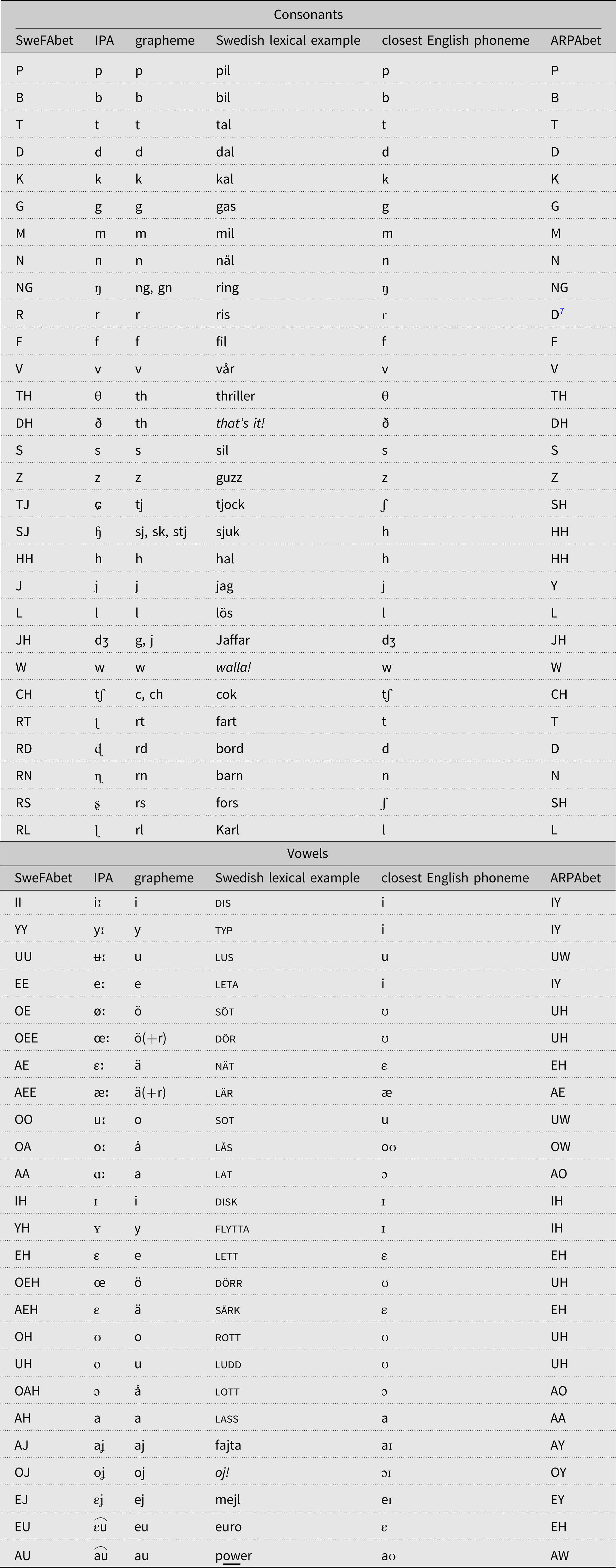 FAVE-Align has transparent architecture and ample documentation, which makes it particularly handy for adaptation. Although is has been adapted before DiCanio et al. Reference DiCanio, Nam, Whalen, Bunnell, Amith and García2013; Coto-Solano & Solórzano Reference Coto-Solano and Sofía2017; Coto-Solano et al. Reference Coto-Solano, Nicholas and Wray2018), detailed instructions for doing so have never been shared, which has resulted in an unfortunate stream of duplicated and uncoordinated efforts. The first author, who has expertise in Swedish phonetics, therefore scoured the code and identified change spots that would allow the use of the English HTK models for the closest corresponding Swedish phoneme. The second author, a seasoned programmer, proofed these change spots and made the hardcoded changes more pythonic. The original English monophones in FAVE-Align are done in ARPAbet, which is an ASCII-compatible system created by the Advanced Research Projects Agency’s (ARPA) Speech Understanding Project. We created a similar system for Swedish that we refer to here as SweFAbet.