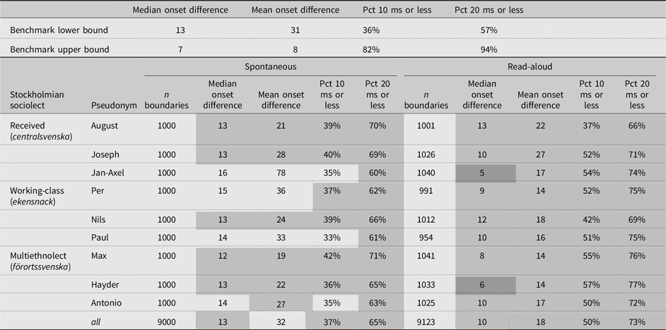 Table 3 organizes the nine speakers and two speech styles according to the four selected metrics. It also offers the minimal standards taken from the literature on forced alignment and the maximal standards derived from the literature on both forced alignment and manual alignment (reviewed in Section 2.4). The results that exceed the minimal standards are highlighted in light gray. The results that exceed the maximum standards are highlighted in dark gray.