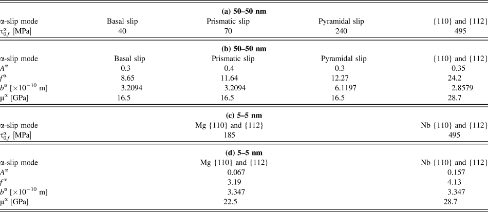 $\tau _0^\alpha$ was assigned for the {110} and {112} slip modes in the BCC materials, but those for BCC Mg were different than those of BCC Nb. (iv) For HCP Mg,
