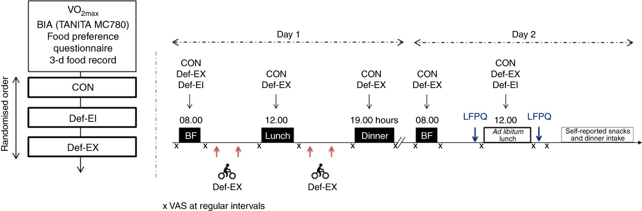Fig. 1 Design of the study. CON, control condition; Def-EI, deficit induced by energy restriction; Def-EX, deficit induced by exercise; BIA, bio-impedance analysis; LFPQ, Leeds Food Preference Questionnaire; VAS, visual analogue scale; BF, breakfast.