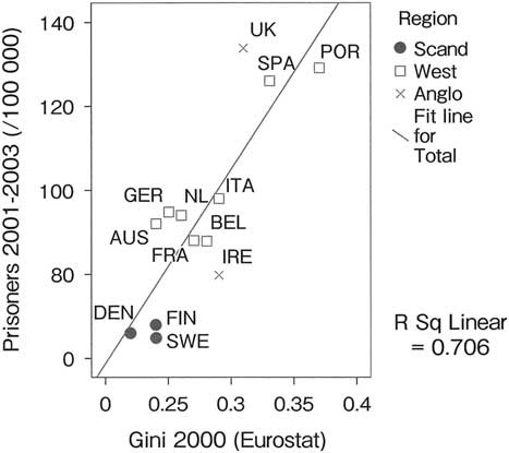 Figure 3 Gini index and prisoner rates 2000 in Europe. This figure refers to the Scandinavian (Scand) countries (three countries; Denmark, Finland and Sweden), the Western European (West) countries (eight countries; Austria, Belgium, France, Germany, Italy, the Netherlands, Portugal and Spain) and the Anglo-Saxon (Anglo) countries (two countries; the UK and Republic of Ireland) Source: Lappi-Seppälä (2008:102).