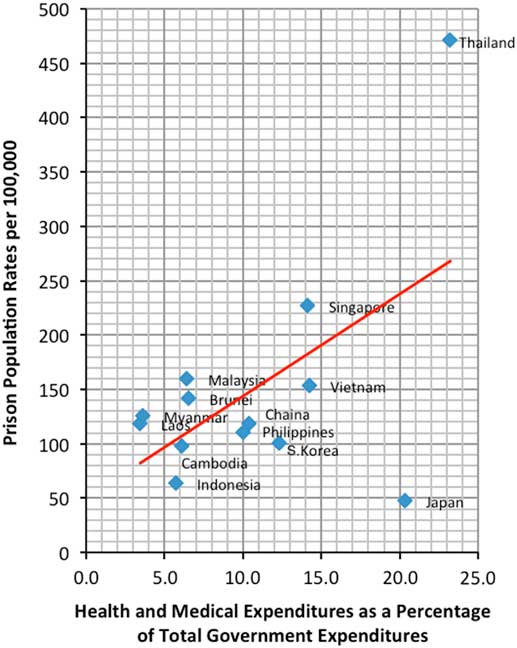 Most ASEAN countries have relatively higher prison population rates than in the ASEAN Plus Three countries and lack the necessary social welfare policies for vulnerable offenders. The exception is Thailand, which has higher social welfare expenditures. However, it also has a high prison population rate due to drug-related offenders that exceed the capacity of the social welfare system. This is despite the fact that Thailand spends more than 20% of its total government expenditure on health and medical care. Thus, the situation in Thailand indicates that its health and medical care policies still have not caught up with the growth in the number of drug offenders generated by the “war on drugs” conducted by the former Prime Minister Thaksin’s administration since 2003 (Fernquest Reference Fernquest2016).Footnote 11