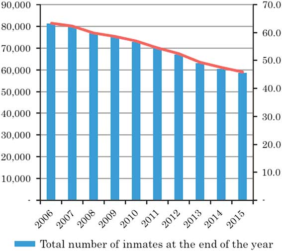 Figure 6 Year-end inmate population of penal institutions and rate per 100,000 population. For a colour figure, see the online version of the article Source: Research and Training Institute, Ministry of Justice, Japan (2016:48).