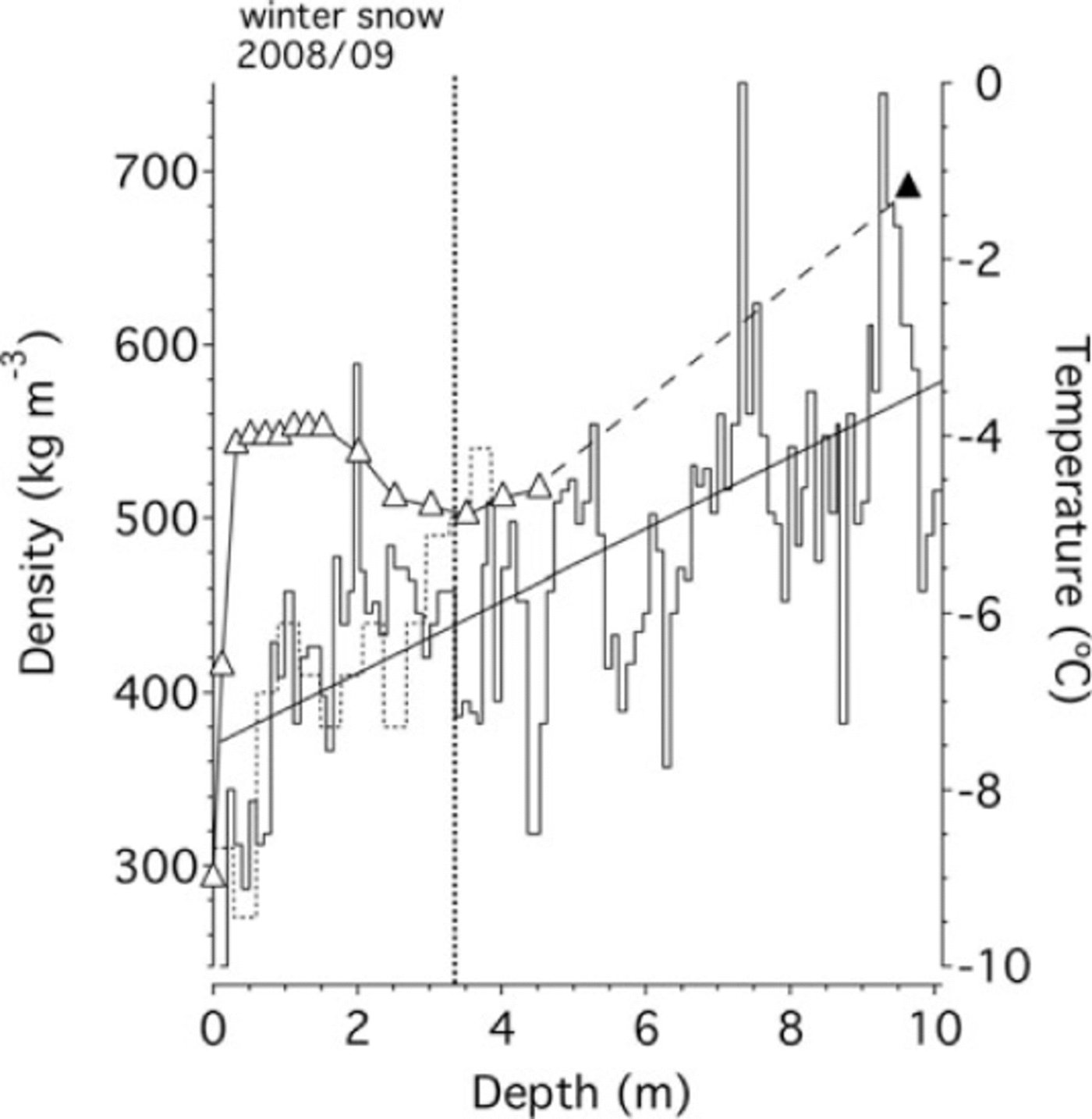 Fig. 5. Snow and firn density obtained from the shallow core (solid curve) and the snow pit (dotted curve). Also shown is the linear trend of the density, D, versus depth, H (D = 21H + 369; R 2 = 0.47). The graph also displays the firn temperature recorded in the snow pit (open triangles) and at ˜10m in the borehole (filled triangle).
