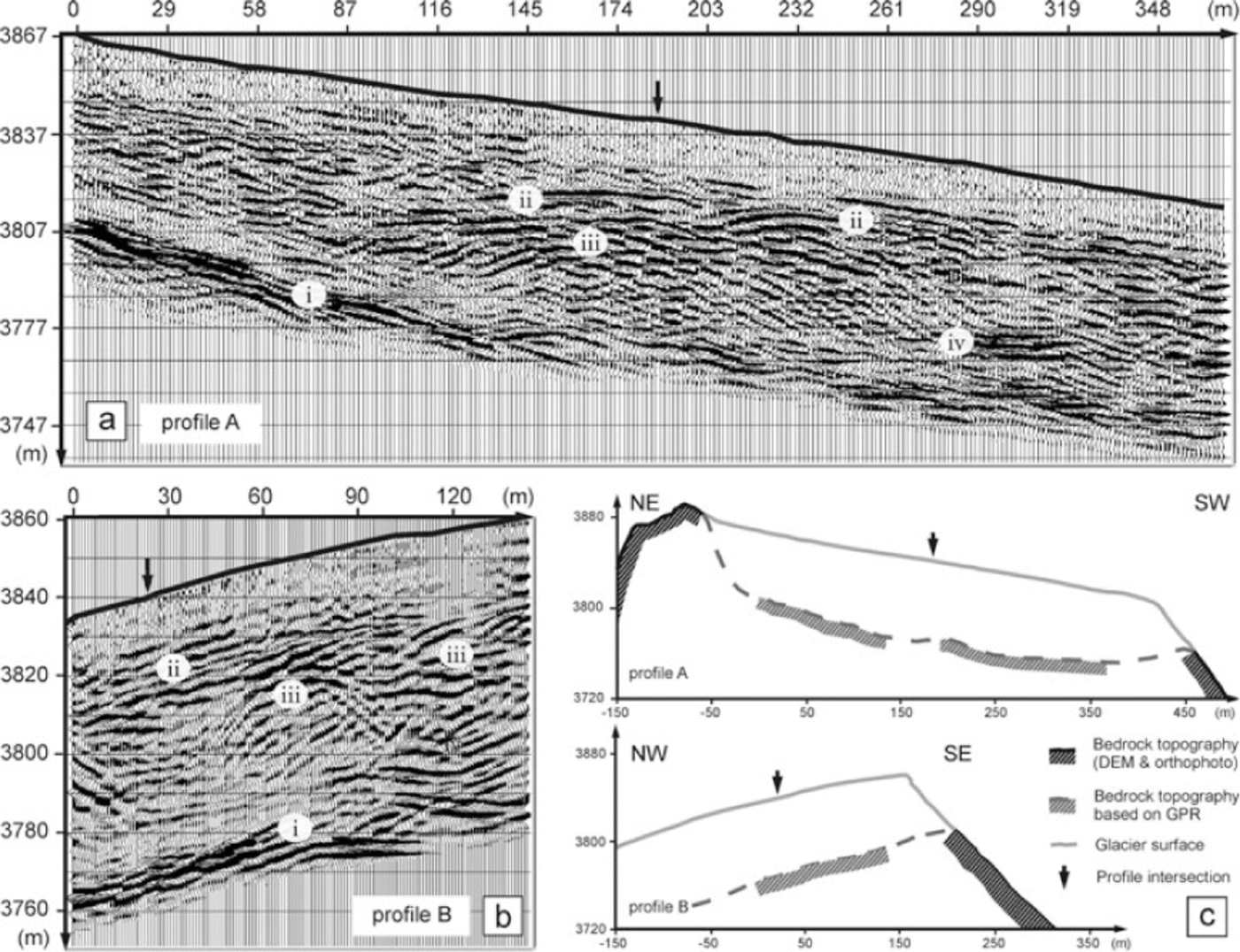 Fig. 6. GPR sections recorded with the 15MHz antennae and interpretation of the bedrock topography of Alto dell’Ortles. The migrated section with topographic correction for profile A is shown in (a), with the following items highlighted: (i) pronounced basal reflector at the glacier bottom, (ii) continuous reflectors near the assumed firn/ice transition, (iii) a zone of point-source reflectors located close to the assumed firn/ice transition, and (iv) strong reflectors near the basal reflector. Profile B is shown in (b), with the same items noted. (c) Vertical sections of the glacier and interpretation of the bedrock topography.