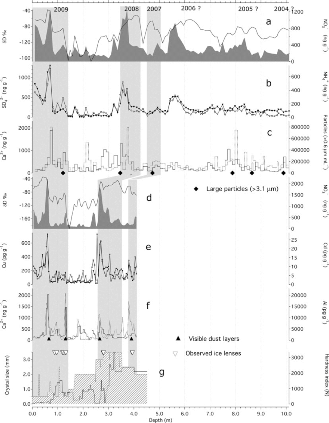 Fig. 7. Comparison of the chemical profiles of the shallow core (a-c) and the snow pit (d-g). Shading indicates the annual warm intervals identified by using the data displayed in this graph. In (a) and (d), δD is shown as a solid curve and NO3 - as a grey area; in (b) SO4 2- is shown by open diamonds, and NH4 + by black diamonds; in (c) and (f) Ca2 + is shown by a solid curve, and dust (c) and Al (f) by dotted lines; in (e) Cd is depicted by open squares and Cu by filled squares; in (g) the crystal size is shown by a hatched area, and hardness index by a solid curve.